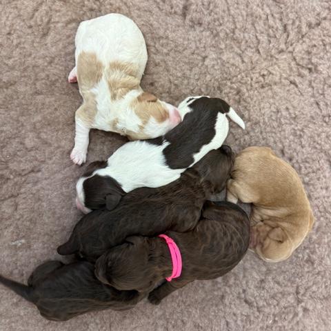 6, AL pups in shades of caramel and chocolate and parti- will mature to medium size 11-14 kgs as adults. D.O.B. 24th of March. Send home date 19th of May. **All Sold**